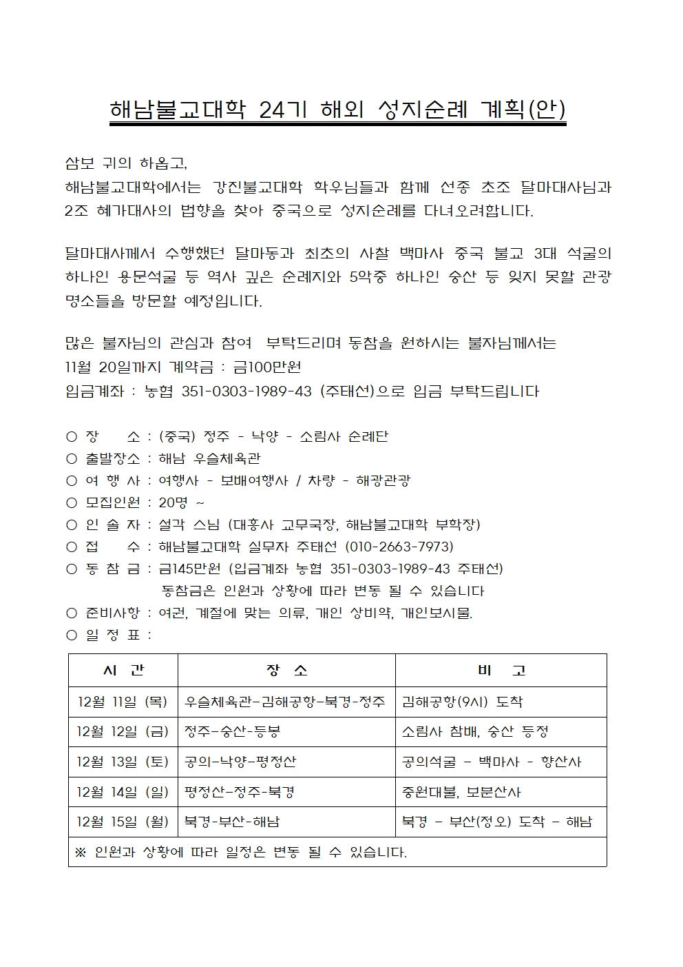 해남불교대학 해외 성지순례 동참자 모집